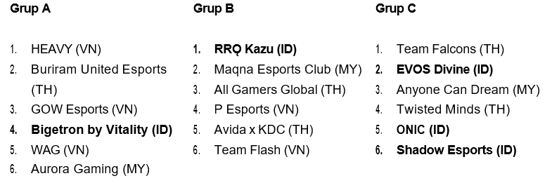 Hasil undian grup (Knockout Draw) telah diumumkan, menempatkan tim-tim Indonesia dalam persaingan ketat melawan tim terbaik dari negara lawan. Indonesia akan diwakili oleh lima tim, yakni Bigetron by Vitality, RRQ Kazu, EVOS Divine, ONIC, dan Shadow Esports, yang siap bersaing membawa nama Indonesia di panggung Asia Tenggara: