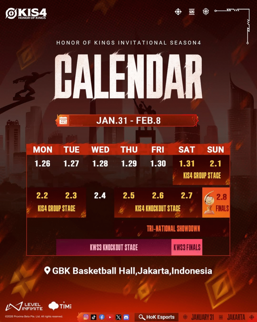 Pengumuman ini menjadi jauh lebih spesial karena Jakarta, Indonesia, kembali menjadi tuan rumah ajang kelas internasional Honor of Kings lagi. Berdasarkan poster dan info yang diunggah, seluruh rangkaian acara akan dipusatkan di GBK Basketball Hall, Jakarta, sebuah venue ikonik yang kerap menjadi saksi bisu sejarah olahraga dan hiburan di Indonesia.