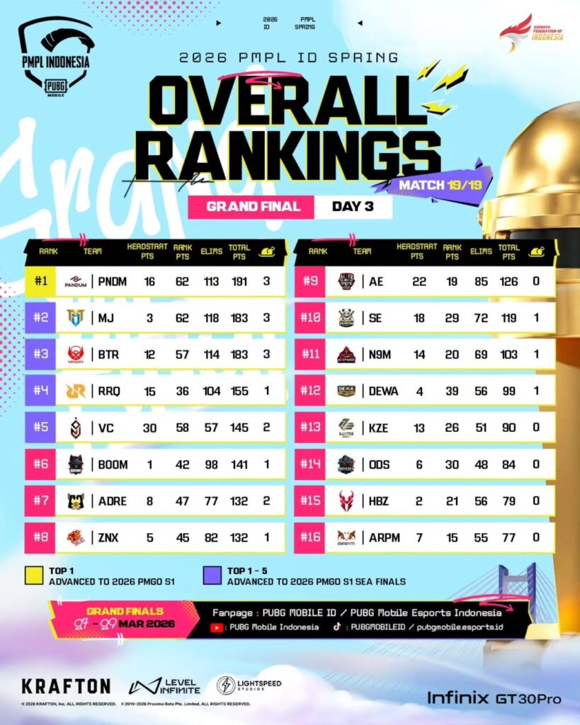 Momentum tersebut mencapai puncaknya di laga-laga akhir, ketika Team Pandum berhasil mengamankan beberapa hasil krusial, termasuk Winner Winner Chicken Dinner (WWCD) yang menjadi pembeda. Lonjakan poin yang mereka raih di hari penutup membuat mereka sukses menyalip Pangeran McJoe dan Bigetron by Vitality, hingga akhirnya mengunci posisi puncak klasemen dengan total poin tertinggi dan memastikan gelar juara 2026 PMPL ID Spring.