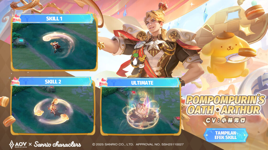 - Pompompurin’s Oath Arthur: Arthur mendapatkan tampilan baru yang stylish melalui skin Pompompurin’s Oath. Setiap ayunan pedang menghadirkan efek karamel yang memukau, lengkap dengan pudding sihir yang berputar di sekelilingnya. Skill ultimate mengubah area pertempuran menjadi panggung cahaya dengan kabut lembut dan kilauan bintang yang hangat.
